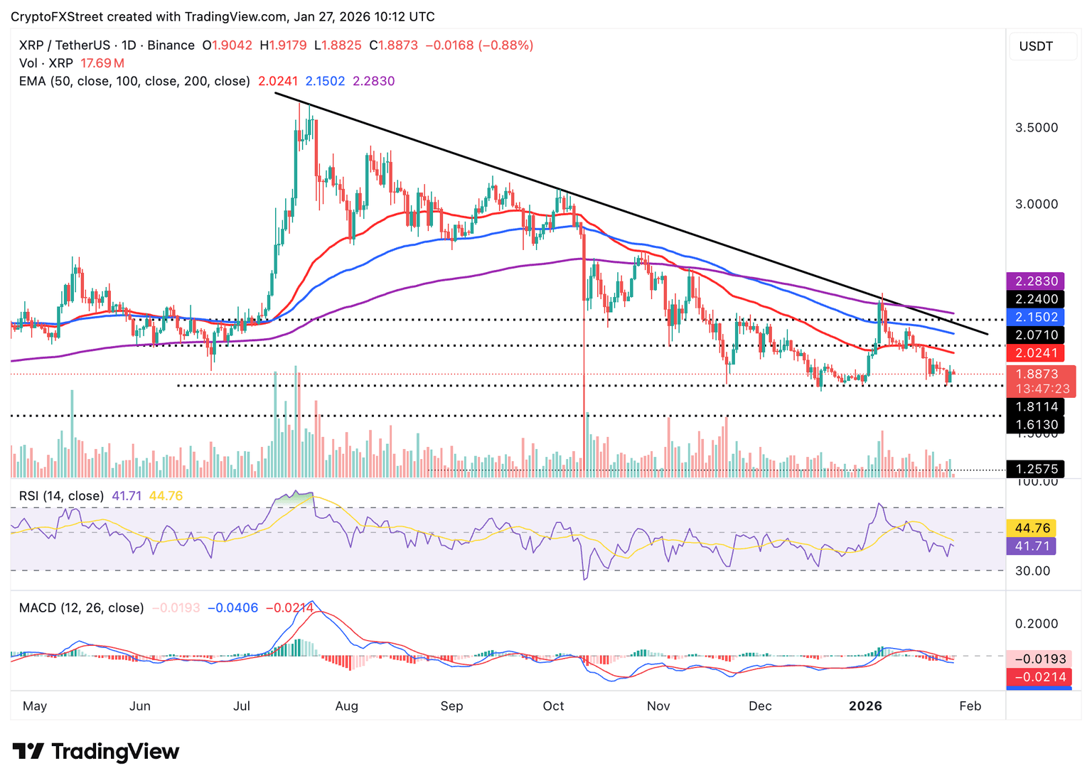 As for XRP, bears have the upper hand, capping price movement below the $2.00 psychological threshold. The cross-border remittance token is trading at $1.88 at the time of writing on Tuesday amid bearish signals.