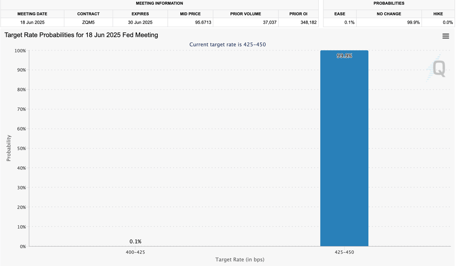 CME Group's FedWatch tool indicates that market participants anticipate the Fed to maintain interest rates in a range of 4.25% to 4.50%.