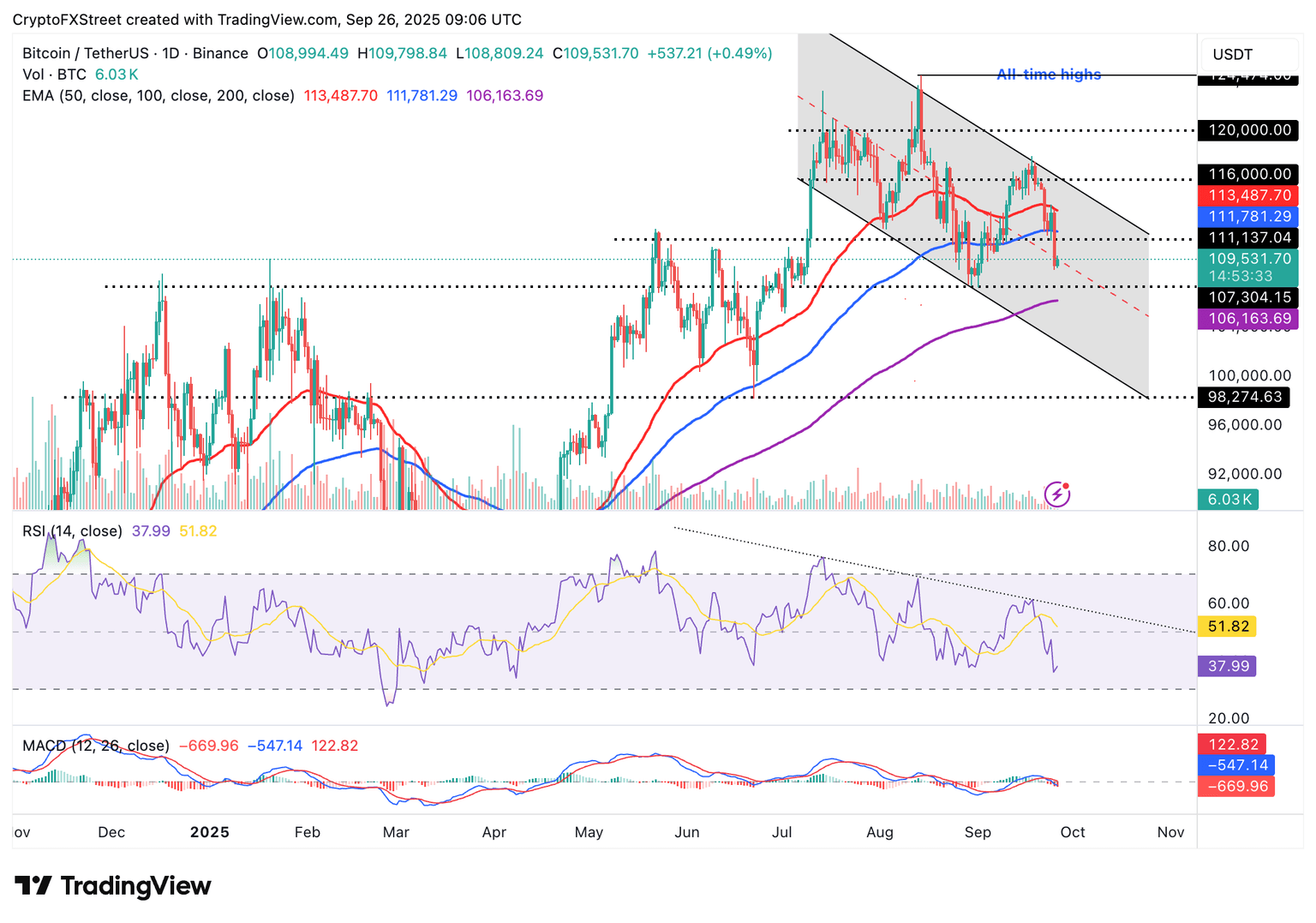 Bitcoin price is also positioned below the 50-day Exponential Moving Average (EMA) at $113,487 and the 100-day EMA at $111,781.