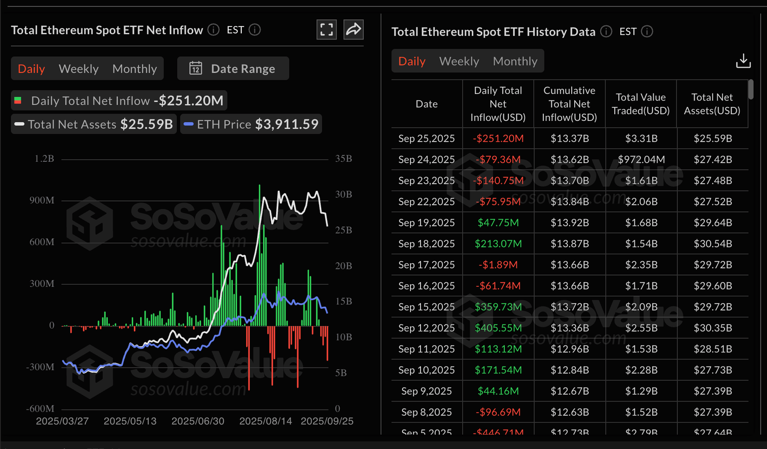Similarly, demand for Ethereum ETF products has also declined significantly this week, with outflows now on their fourth consecutive day. According to SoSoValue data, ETH US ETFs saw outflows of $251 million on Thursday, bringing the cumulative net inflow to $13.37 billion.