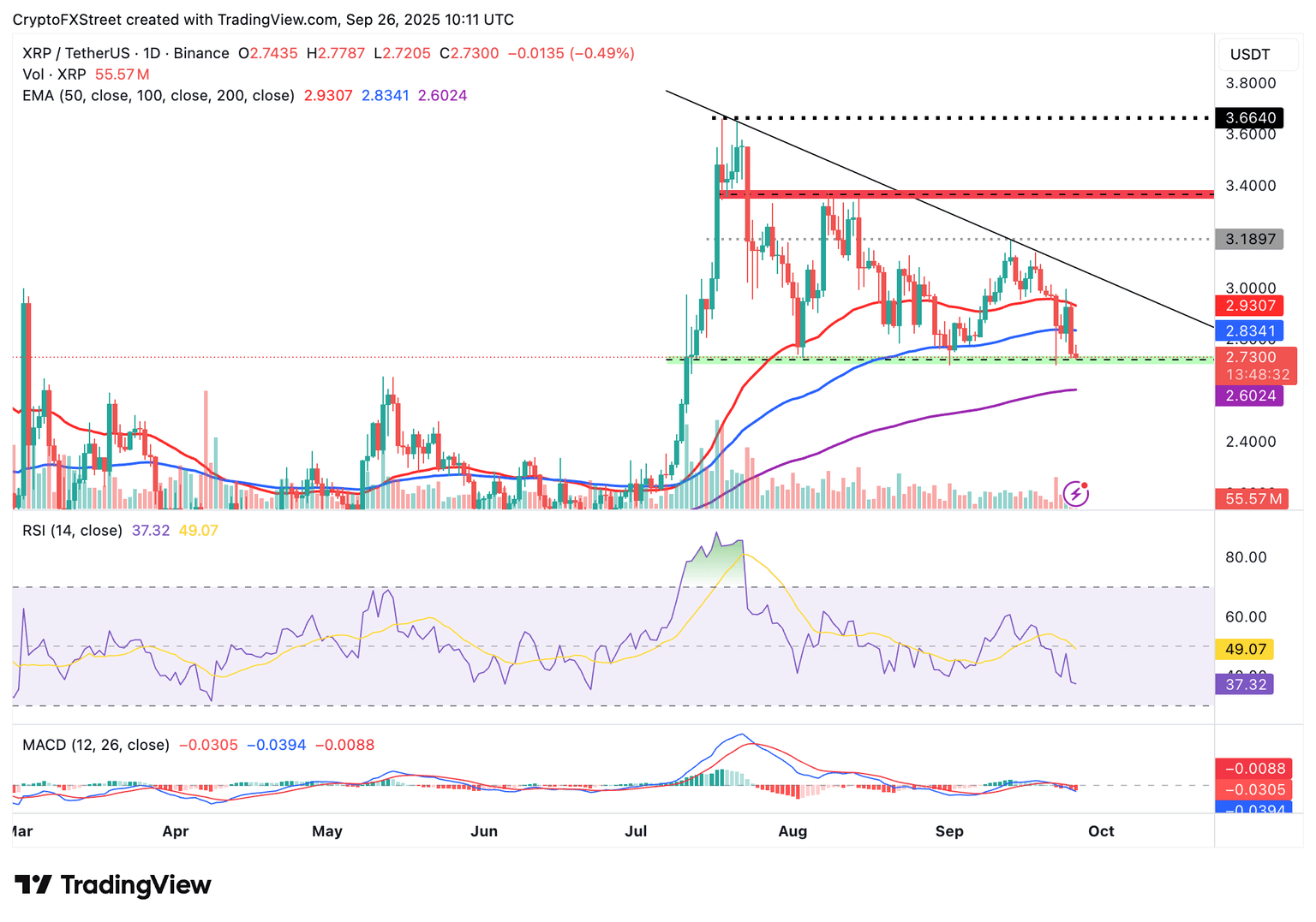 As for XRP, bears are largely in control at the time of writing on Friday, underlined by a sell signal maintained by the MACD indicator since Monday. A steady decline in the RSI to 37 reinforces the bearish grip as bullish momentum fades.