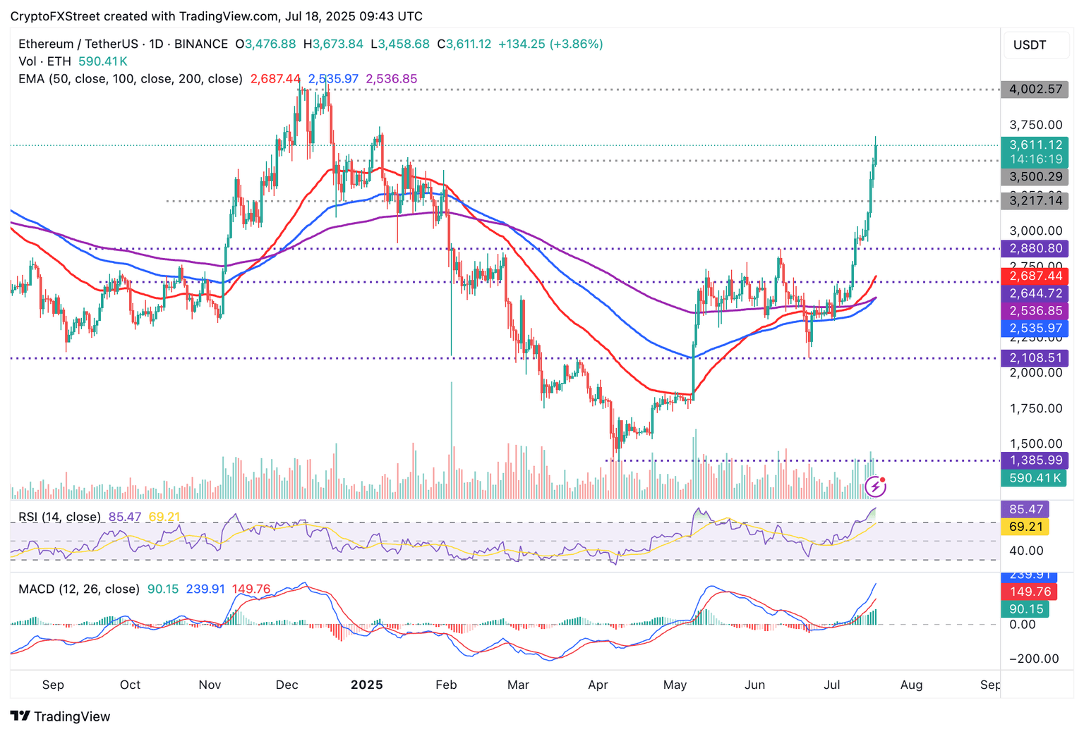 XRP broke on Friday above its previous record high of $3.40, initiating a new price discovery phase. It reached $3.66 before retracing to trade at around $3.41. Meanwhile, Ethereum's bullish outlook sees it trading above $3,600, undermined by steady institutional demand.