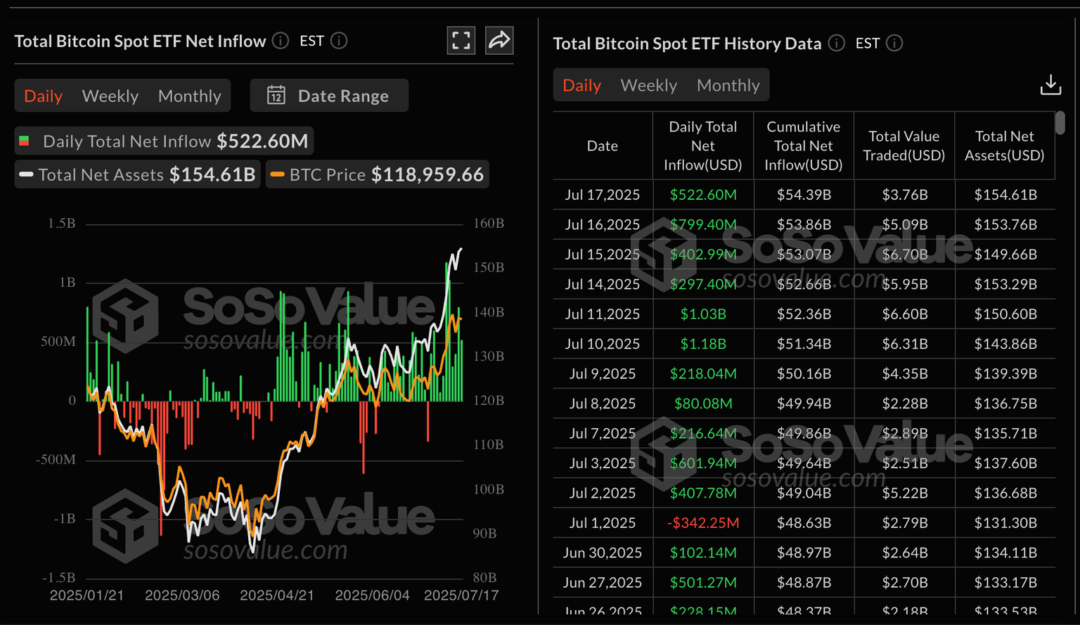 Institutional interest in crypto assets, particularly Bitcoin and Ethereum, shows no signs of fatigue despite the price of BTC hovering slightly below record highs. This is evidenced by the steady inflow of Exchange Traded Funds (ETFs), which surpassed $522 million on Thursday for BTC spot ETFs licensed in the US.