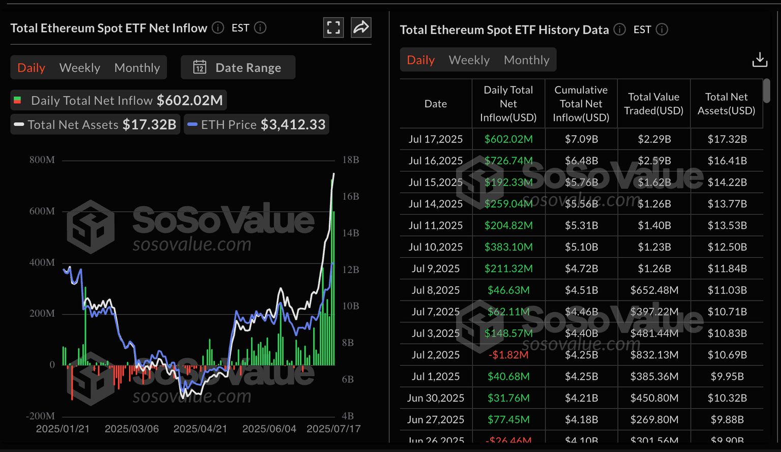 As for Ethereum, the spot ETFs operating in the US collectively experienced a net inflow of $602 million, the second-highest daily amount in history after Wednesday's $726 million. BlackRock's ETHA dominated the inflows with over $546 million, followed by Grayscale Ethereum Mini Trust (ETH) with nearly $30 million.