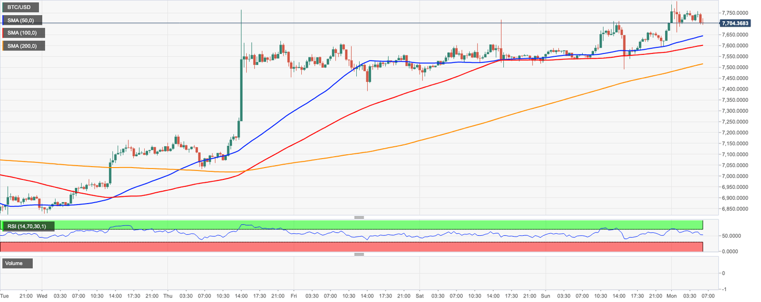 BTC/USD hit $7,800 during early Asian hours and retreated to $7,700 by press time. The first digital coin has gained over 6% in the recent 24 hours and stayed unchanged since the beginning of Monday. Now it is trading with the short-term bearish bias amid low volatility.