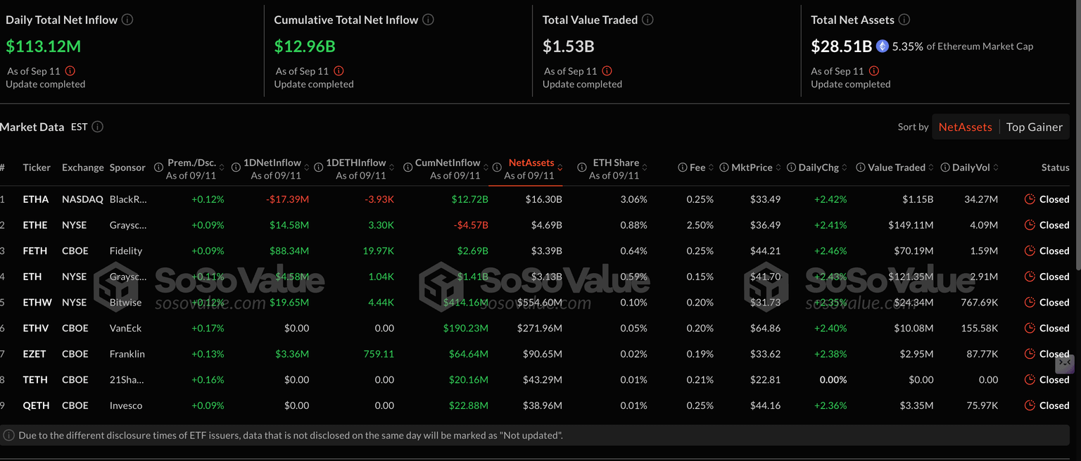 Ethereum spot ETFs in the US have now experienced their third consecutive day of inflows, following six days of outflows, which reflects a significant shift in sentiment. The chart below shows that ETH ETFs saw $113 million in total daily inflows on Thursday, bringing the cumulative net inflow to $12.96 billion and the total net assets to $28.51 billion.