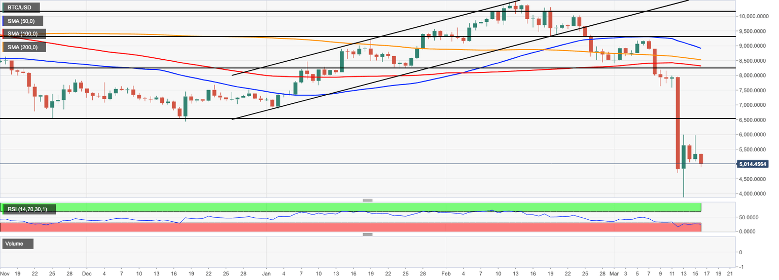 BTC/USD is hovering around $5,000, down 6.8% since the start of the day. The first digital coin is moving within a short-term bearish trend vulnerable to further losses amid expanding volatility.