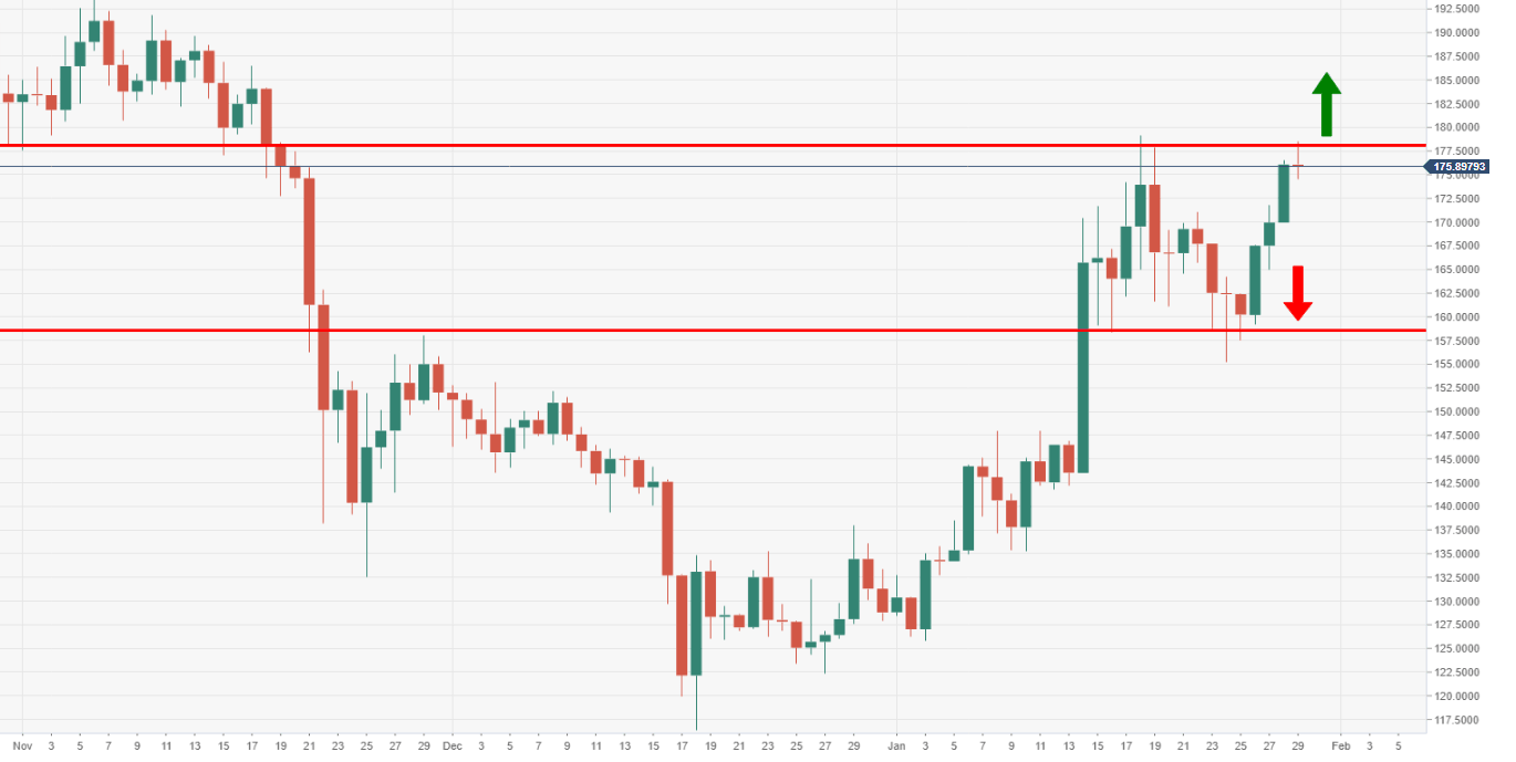 ETH/USD is currently trading at $177.40 (-3.60%), the bears force the price back below $180.