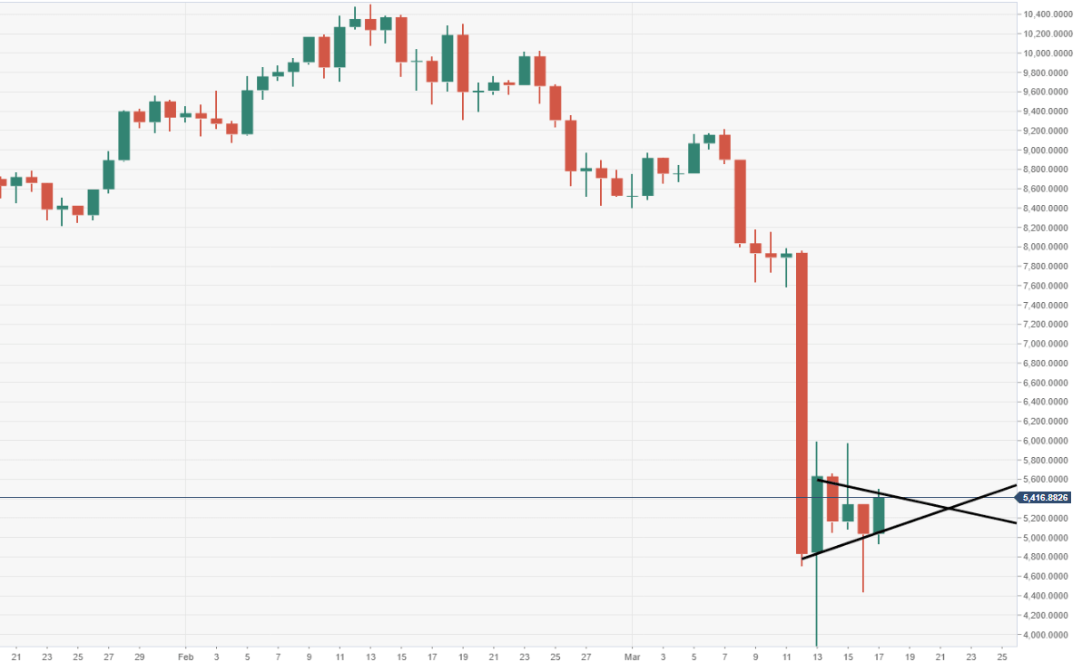 Chart of the day: BTC/USD daily chart (price action is narrowing within a bearish pennant structure)