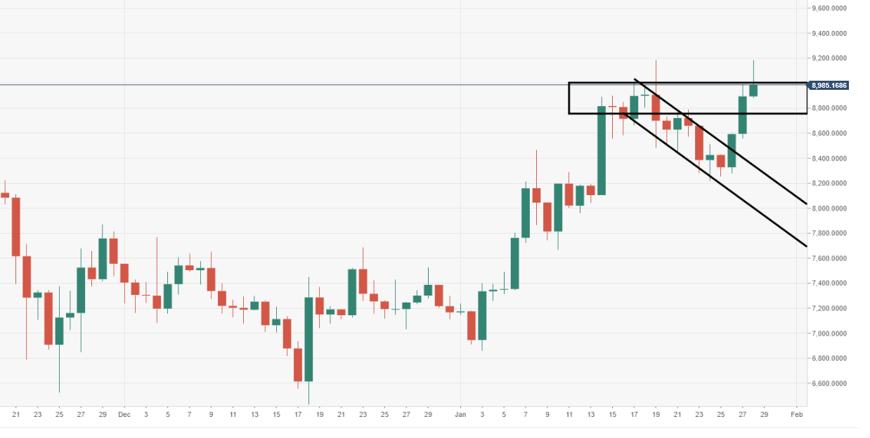 BTC/USD is currently trading at $9050 (+1.40%) in the afternoon in US hours. Bulls managed to reclaim the psychological $9000 mark.