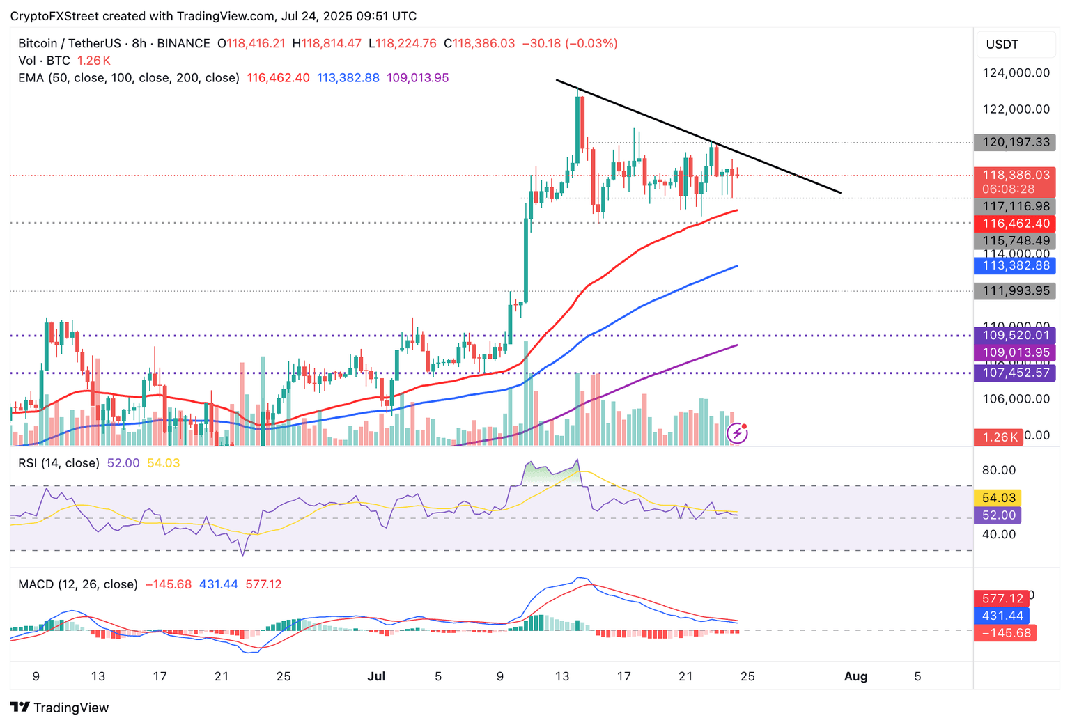 Notably, key moving averages hold significantly below the price of BTC on the 8-hour chart, affirming a mid-term bullish structure. In the event of a reversal, the 50-period Exponential Moving Average (EMA) at $ 116,462, the 100-period EMA at $113,382, and the 200-period EMA at $109,013 could serve as tentative support levels.