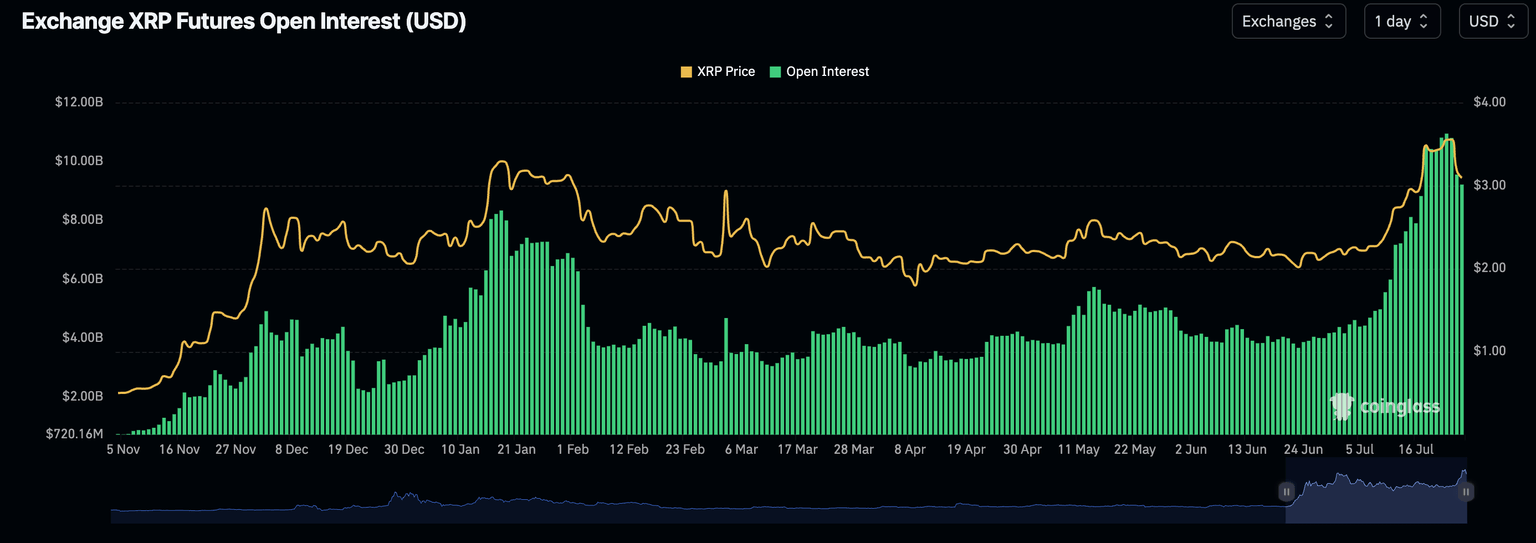 XRP futures OI is experiencing a steeper drop after the price hit a new record high of $3.66 on Friday. As shown in the chart below, OI currently averages $9.27 billion, down 15% from $10.94 billion recorded on Tuesday.