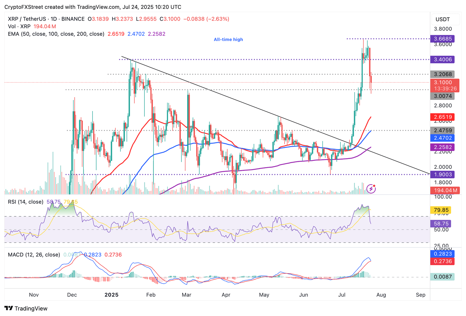 Cryptocurrencies are facing relatively strong headwinds on Thursday, particularly altcoins led by Ethereum (ETH) and Ripple (XRP). The largest smart contracts token is consolidating at around $3,630, marking a 6% decline from recent highs of $3,858. XRP extended the down leg to an intraday low of $2.95 before rising slightly to trade at $3.10 at the time of writing.