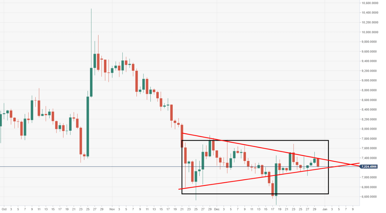 - BTC/USD is currently trading at $7,224 (-2.15%) in the afternoon in U.S. hours, price action is consolidating underneath the $7500 barrier.
