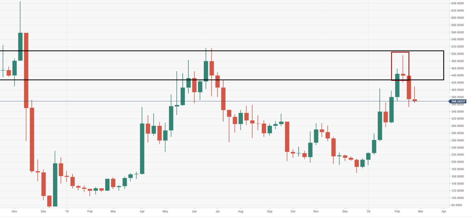 Chart of the day: BCH/USD weekly chart (Evening star formation has seen another week heavily close in the red, big risk of reversal)