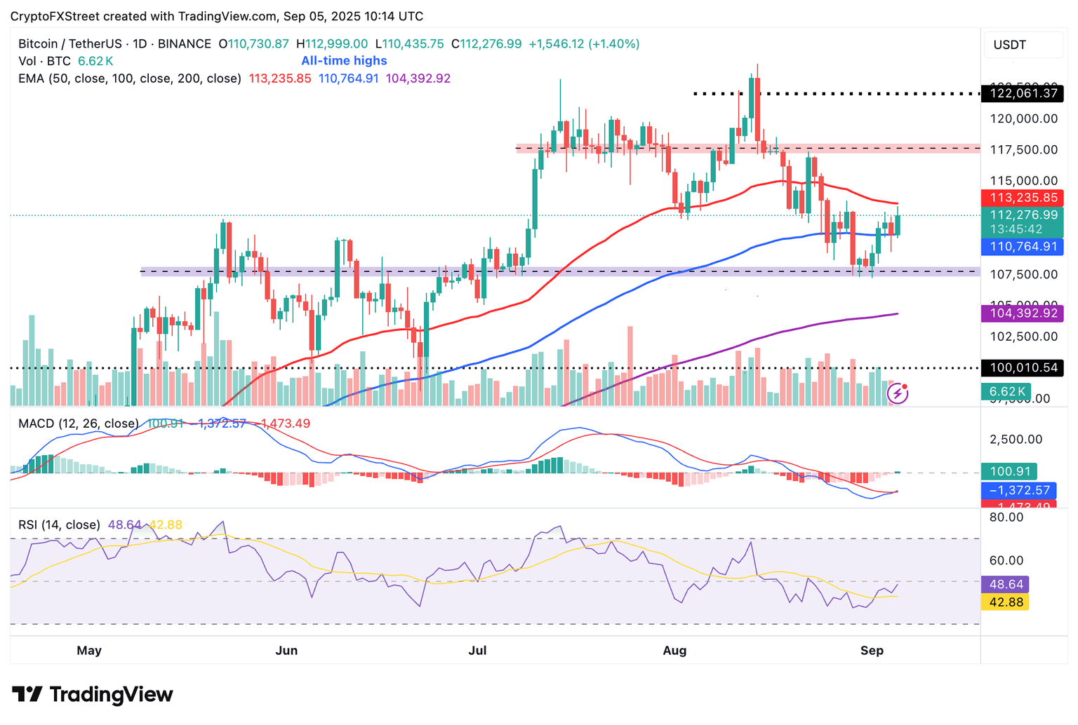 Bitcoin price edges higher on Friday following a brief correction below $110,000 the previous day. The 100-day Exponential Moving Average (EMA) at $110,765 provides immediate resistance. However, price action is currently capped below the 50-day EMA at $113,236.