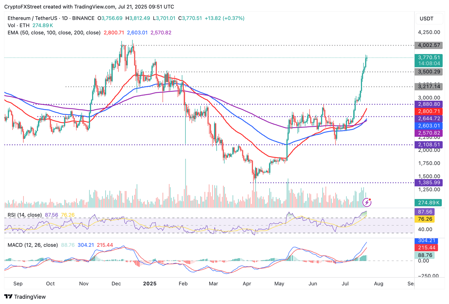 Ethereum price holds firmly to the gains accrued over the last nine days, trading at $3,770 at the time of writing on Monday. The largest smart contracts token flaunts a solid bullish structure, backed by two recently confirmed Golden Cross patterns.