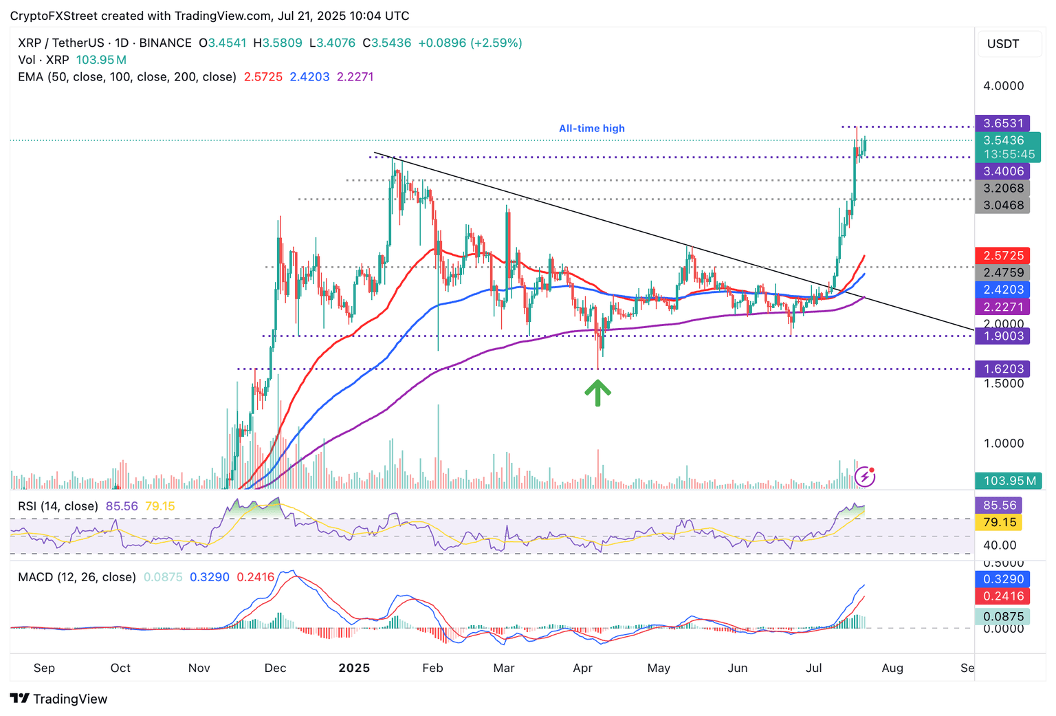 - Bullish momentum drives XRP toward the recent record highs, increasing the chances of a breakout to $4.00.