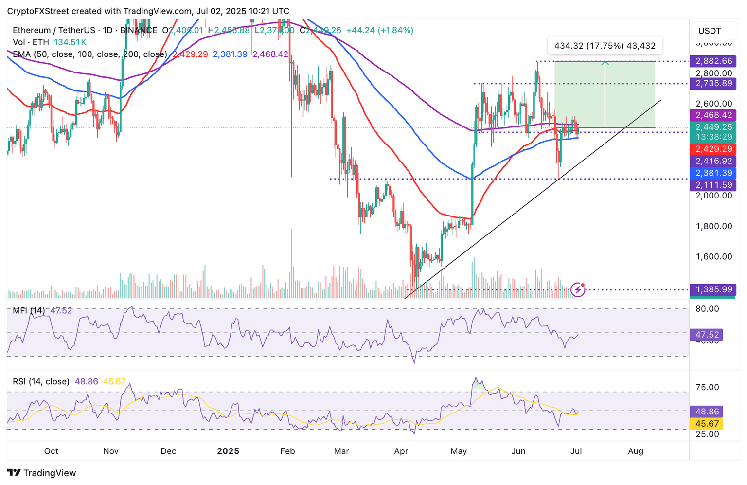 Ethereum is printing a green candle on the daily chart after rebounding from support provided by the 100-day EMA at around $2,381. The largest smart contracts token by market capitalization hovers at $2,449, up almost 2% on the day. This intraday uptick can be attributed to improving market sentiment, with the MFI indicator approaching the midline.