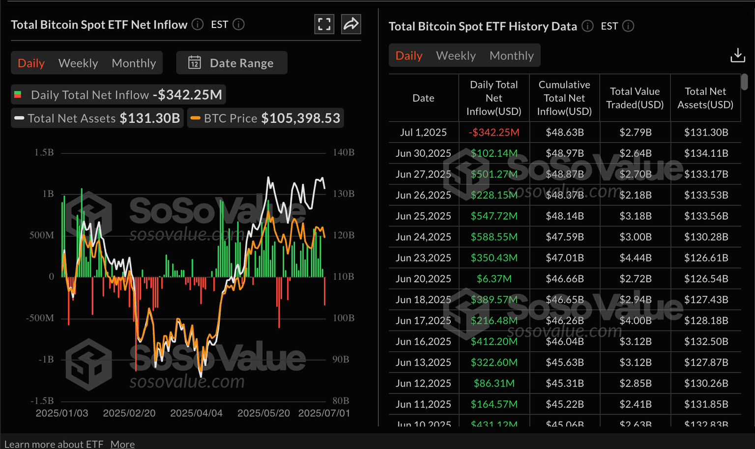 Bitcoin spot ETFs broke a 15-day daily net inflow streak with approximately $342 million in outflows on Tuesday. None of the 12 spot ETFs currently approved saw inflows, with Fidelity’s FBTC leading with outflows of nearly $173 million.