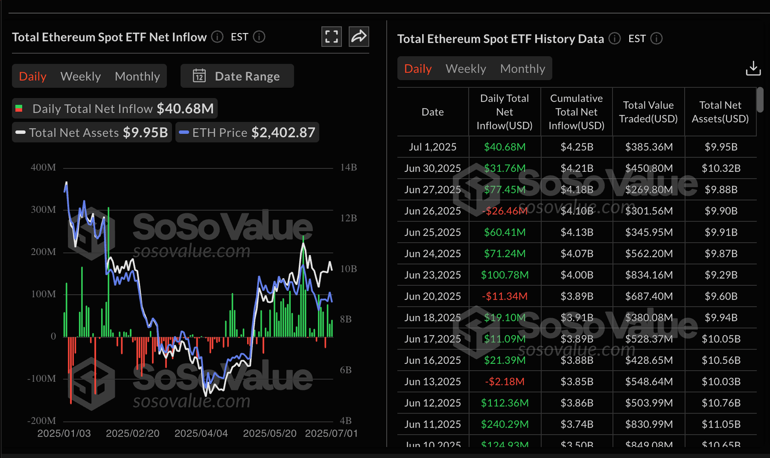 On the contrary, Ethereum spot ETFs extended their three-day bullish streak with about $41 million in net inflow volume. The ETFs boast $4.25 billion in cumulative total net inflow, while net assets stand at $9.95 billion.