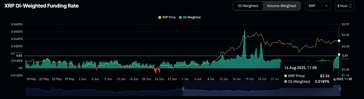 Meanwhile, interest in XRP remains elevated, considering the steady rise in the futures weighted funding rate, averaging at 0.0189%. The chart below shows that the weighted funding rate dipped slightly in the negative on August 1 before traders increased exposure, leveraging long positions in XRP.