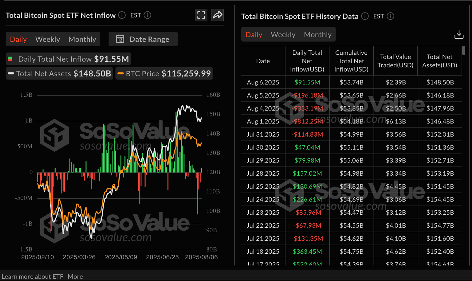 Bitcoin spot ETF stats | Source: SoSoValue