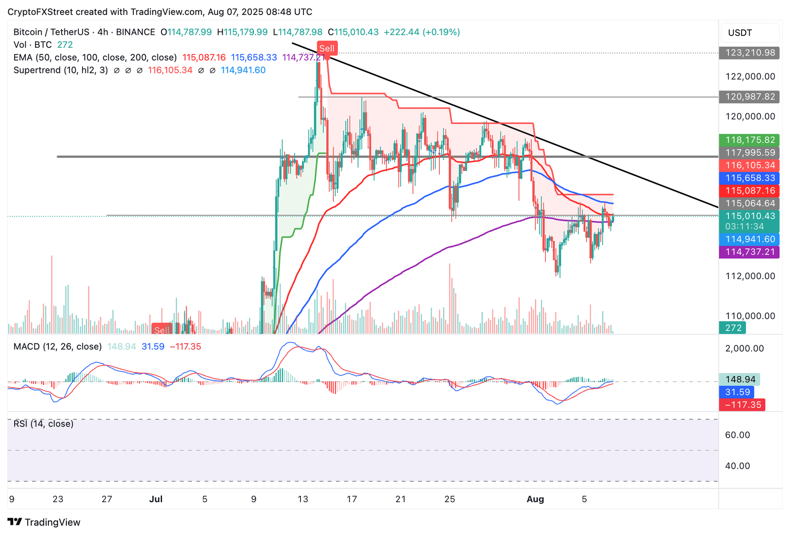 Bitcoin price is trading at around $115,000 while holding onto support provided by the 200-period Exponential Moving Average (EMA) at $114,737 on the 4-hour chart. The 50-period EMA at $115,087 caps price movement on the upside, with the 100-period EMA at $115,658 likely to slow down the recovery in upcoming sessions.