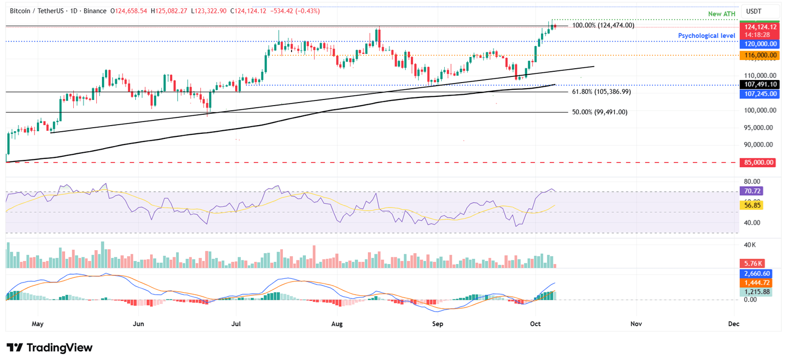 Bitcoin price started the week on a positive note, hitting a new all-time high of $126,199 on Monday after surging more than 10% in the previous week. At the time of writing on Tuesday, it steadies at around $124,000.