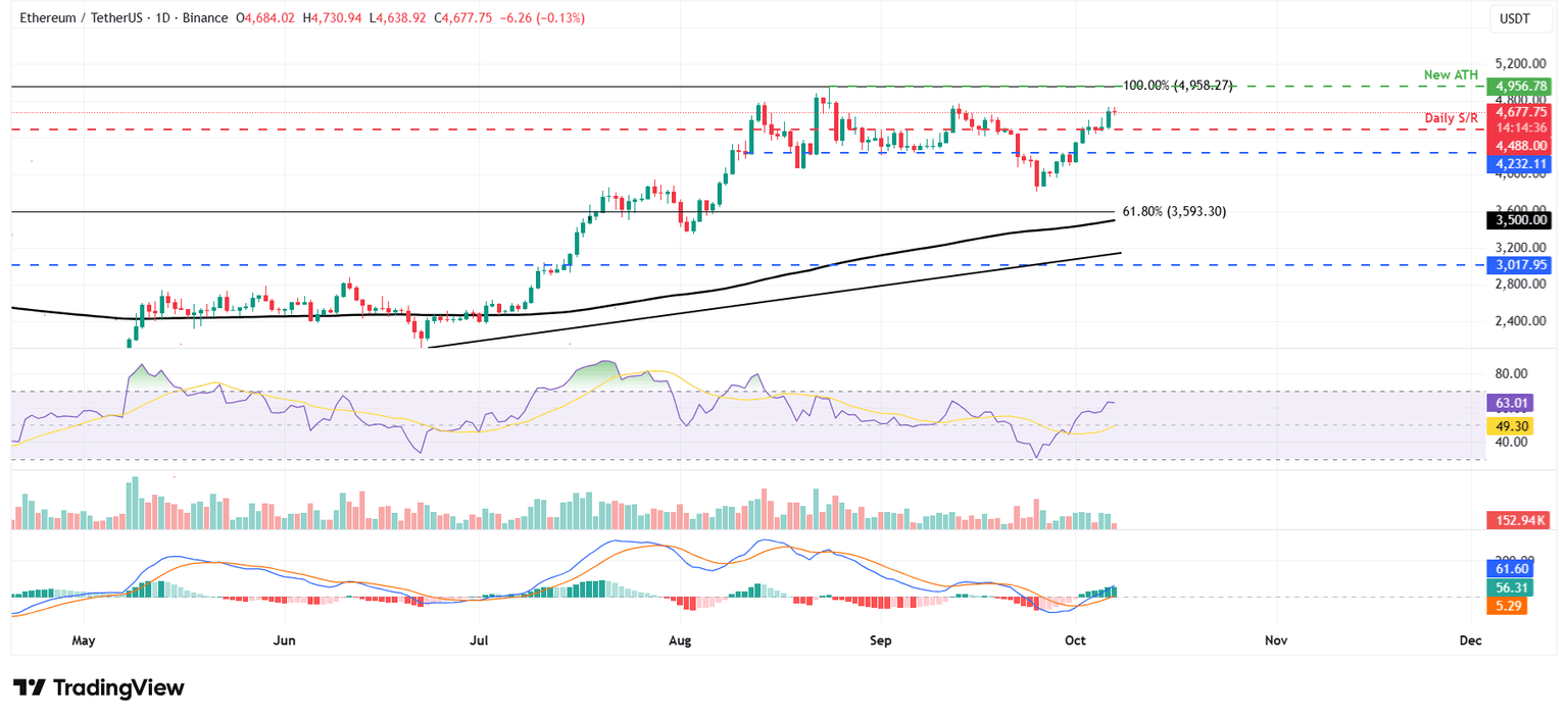 Ethereum price broke above the daily resistance at $4,232, rallied by nearly 9% last week and closed above the next key resistance at $4,488. ETH found support around the $4,488 on Monday and rose 3.76% that day. At the time of writing on Tuesday, it hovers around $4,677.