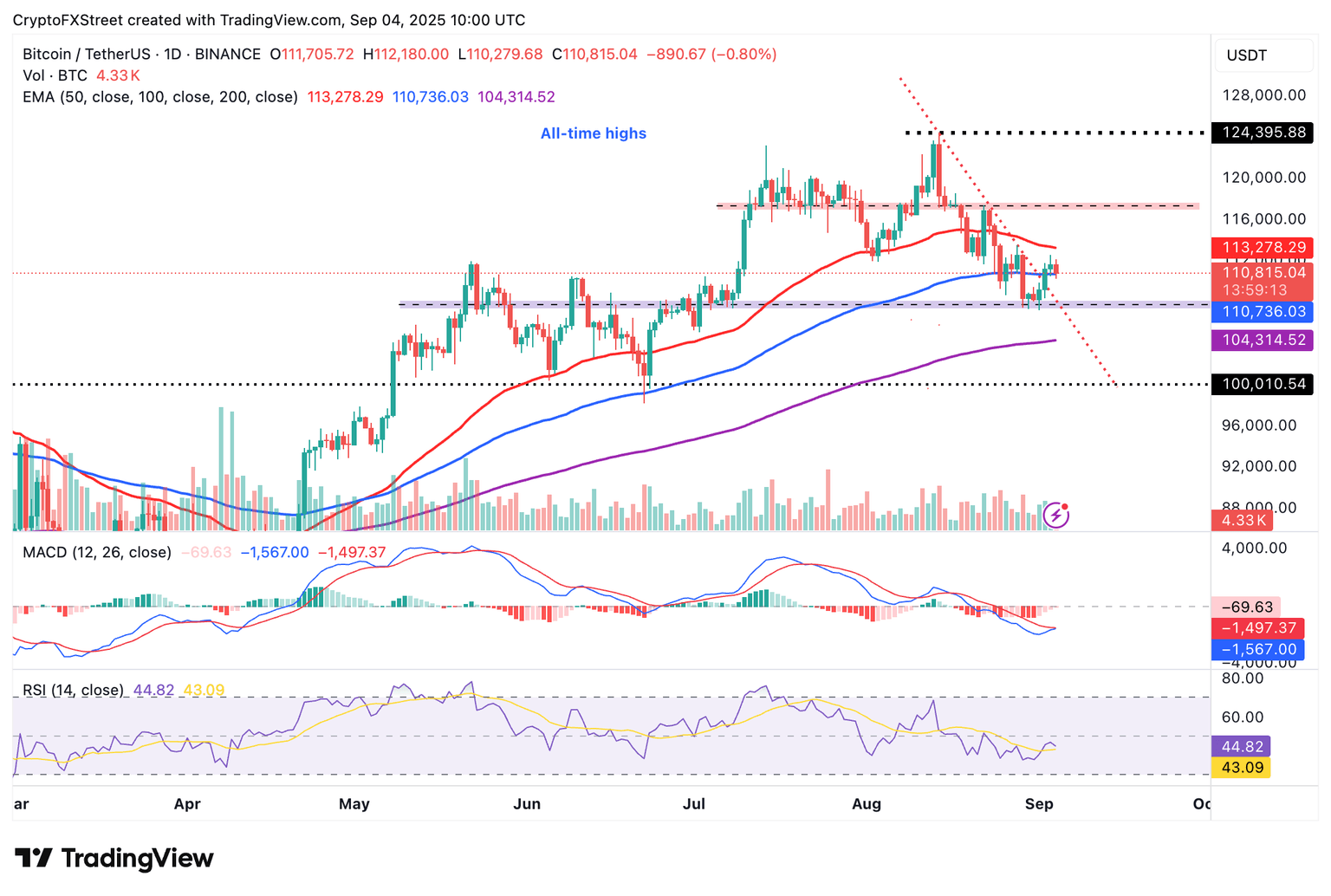 Bitcoin price has recently broken above the trendline resistance but was rejected at around $112,500 on Wednesday. The price is currently positioned above the 100-day Exponential Moving Average (EMA) support at $110,736.