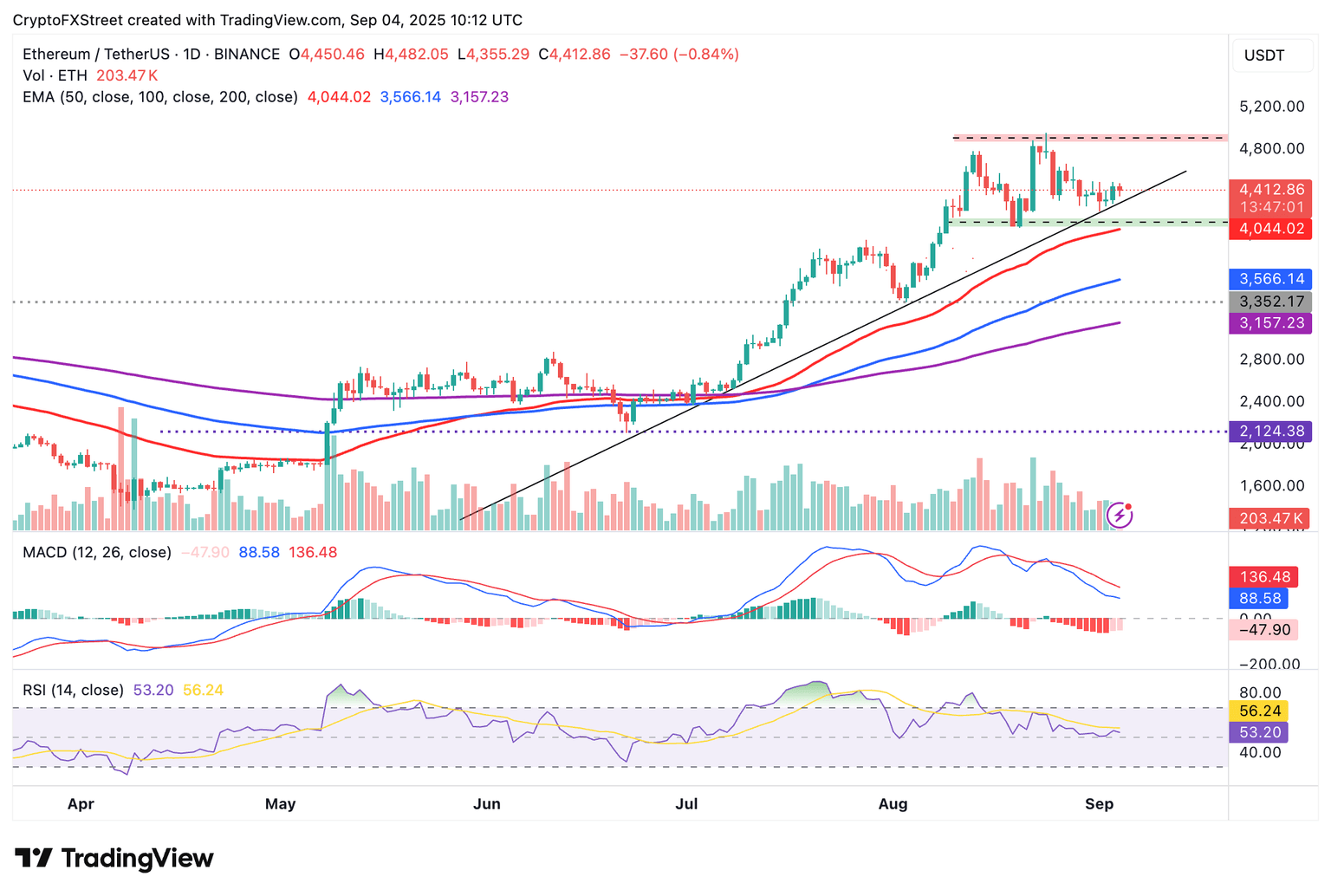 Traders should monitor the ETH price reaction to the ascending trendline illustrated on the daily chart below. The price has since bounced off this trendline in early July, signalling a potential reversal if tested. Other key support levels include the 50-day EMA at $4,044 and the 100-day EMA at $3,566.