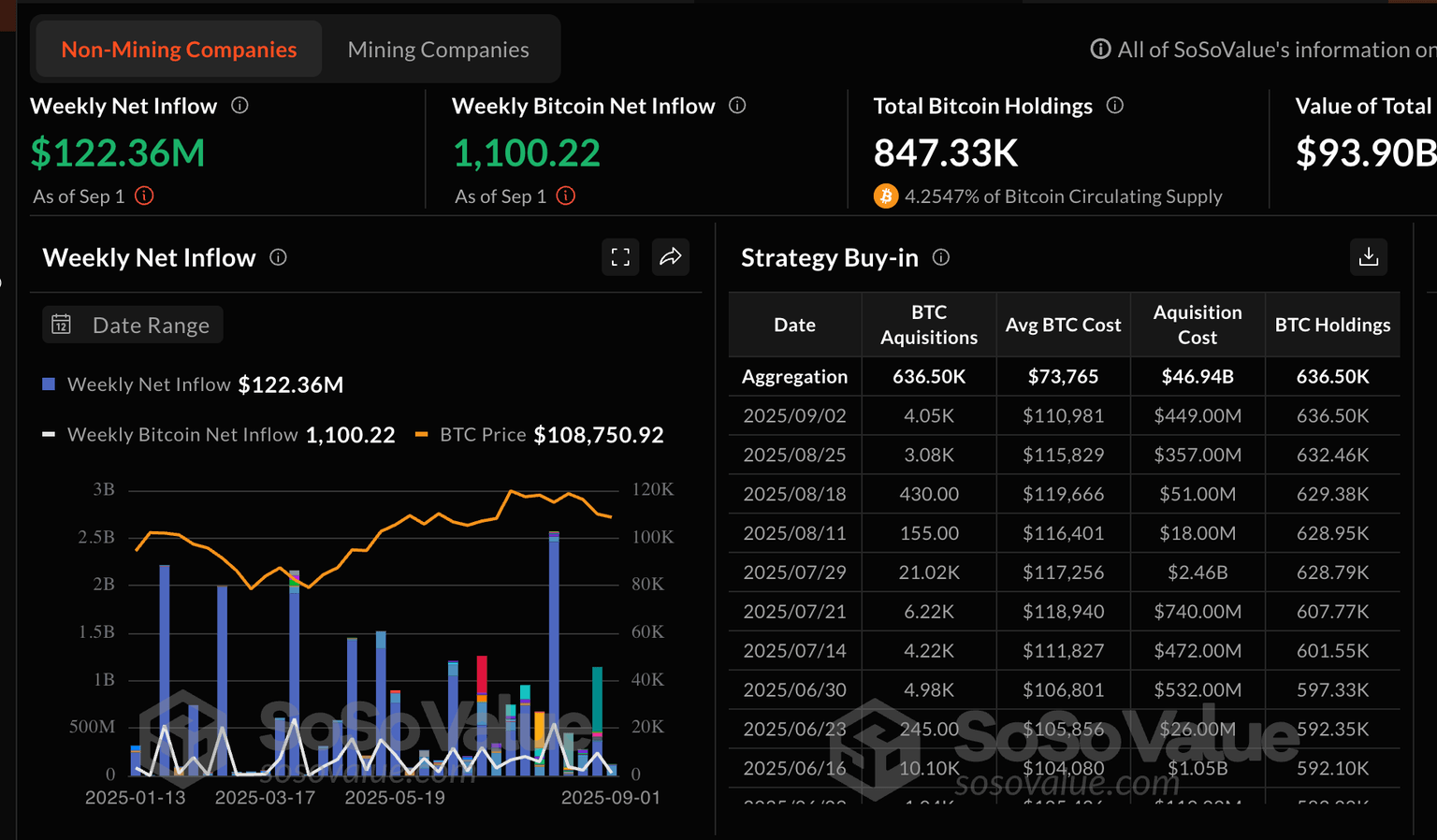 Bitcoin treasury balances have continued to grow month-over-month (MoM) this year, indicating steady demand despite fluctuations in the price. In total, Bitcoin treasuries hold approximately 847,330 BTC valued at $93.9 billion. SoSoValue data indicates a weekly net inflow of 1,100 BTC, valued at approximately $122 million.
