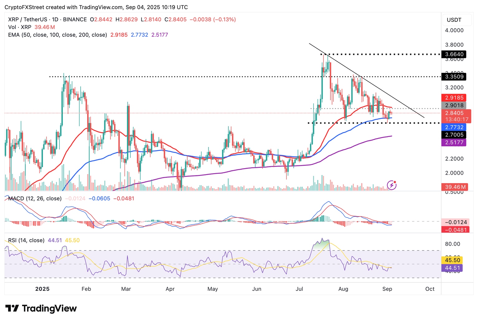 As for XRP, its current position between the 100-day EMA support at $2.77 and the 50-day EMA resistance at $2.91 points to a prolonged consolidation period ahead of the next breakout. A sell signal from the MACD indicator since July 25 hints at the downtrend continuing toward the 200-day EMA support at $2.51.