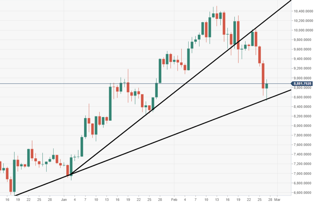 BTC/USD is currently trading at $8911 (+1.50%), the price has stabilized but remains vulnerable underneath $9000.