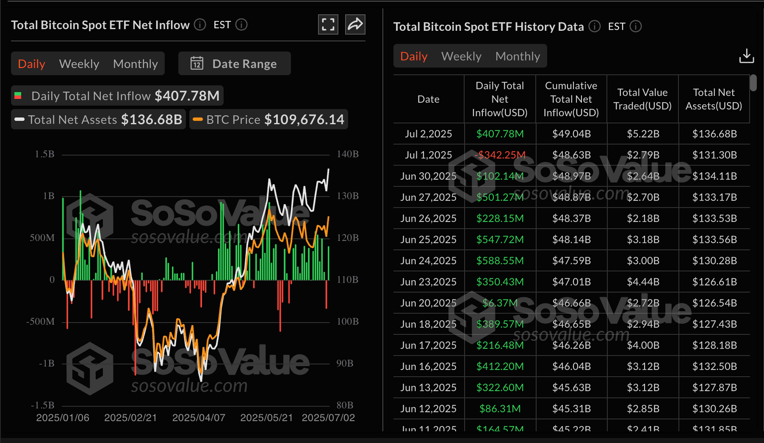 Bitcoin spot Exchange Traded Funds (ETFs) saw a total net inflow of approximately $408 million on Wednesday, with none of the 12 ETFs licensed in the United States (US) experiencing a net outflow. According to SoSoValue data, Fidelity’s FBTC had the highest net inflow, averaging around $184 million.