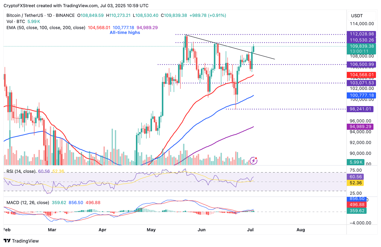 Bitcoin’s price is extending the up leg toward the round-figure resistance at $110,000 after breaching the hurdle at $109,000. The daily chart below shows BTC extending its gains above a critical descending trendline resistance, which could boost risk-on sentiment.