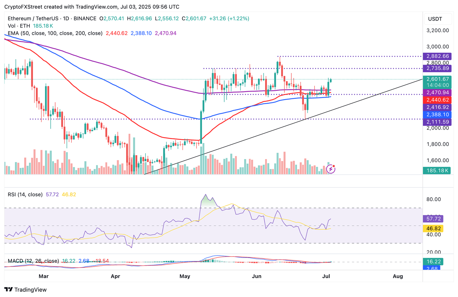 Ethereum’s price is edging higher, trading at around $2,601 at the time of writing. The largest smart contracts token by market capitalization holds above key moving averages, including the 100-day Exponential Moving Average (EMA), currently at $2,388, the 50-day EMA at $2,440 and the 200-day EMA at $2,470. This technical position backs the bullish structure.