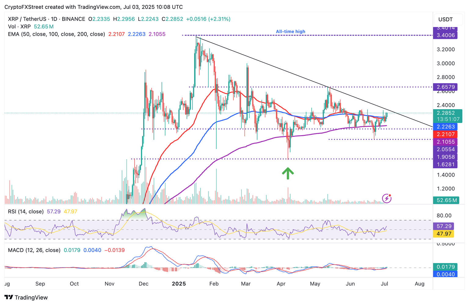 The price of XRP holds above the 50-day EMA at $2.21 and the 100-day EMA at $2.22. Technical signals from the RSI, pointing upwards above the midline, validate the uptrend’s strength, while the MACD indicator’s buy signal calls on traders to increase exposure to XRP.