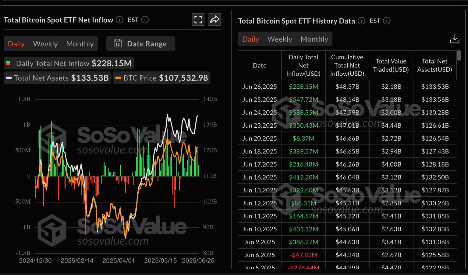Bitcoin spot Exchange Traded Funds (ETFs) net inflow volume hit a 13-day streak on Thursday, with SoSoValue reporting approximately $228 million. Although significantly lower than the $548 million posted on Wednesday, the net inflow volume affirms the steady risk-on sentiment. Cumulatively, BTC spot ETFs have amassed around $48.4 million in net inflows, with net assets averaging nearly $134 billion.