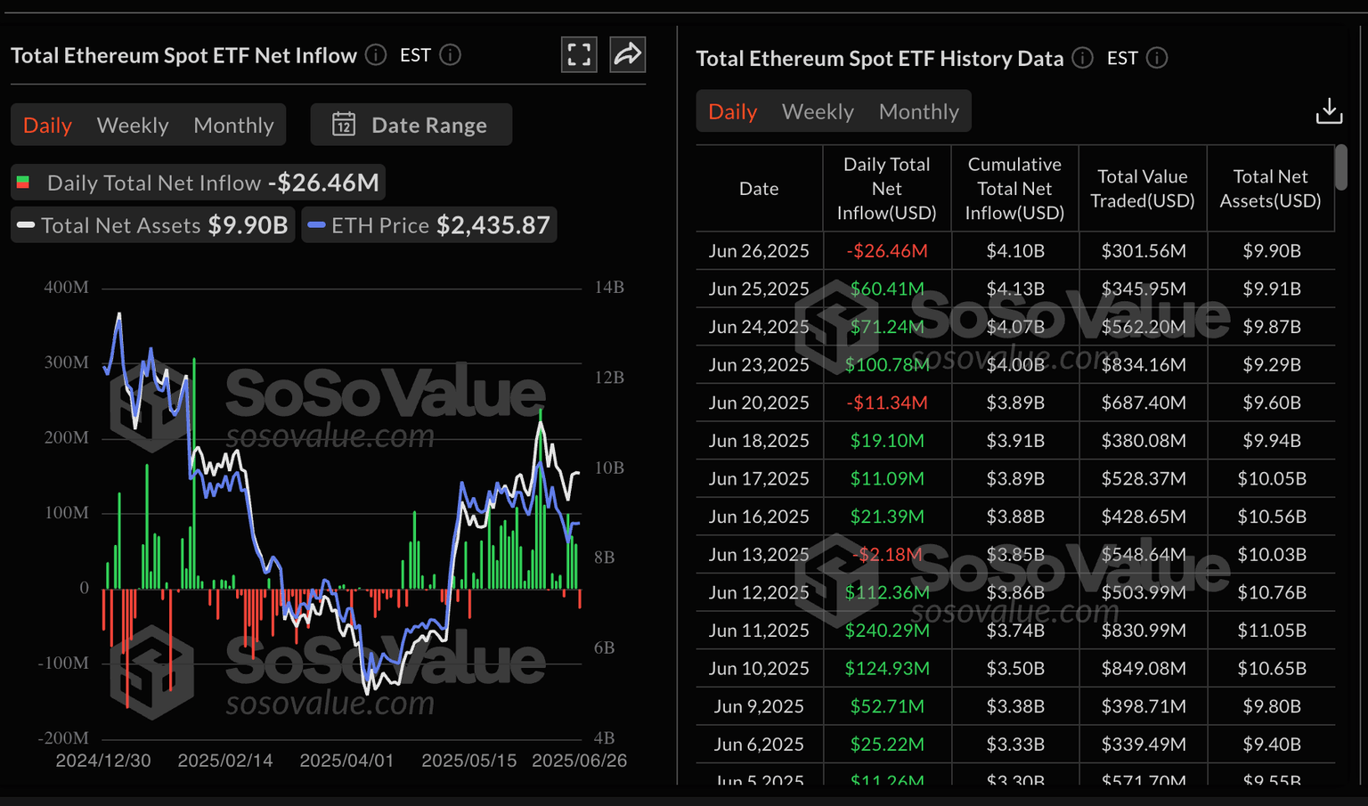 On the other hand, Ethereum spot ETFs broke a three-day net inflow streak on Thursday, with outflows summing to approximately $26.5 million. This outflow volume reflects diminishing investor interest in altcoins, which continue to struggle to recoup the losses triggered after the US struck Iranian nuclear sites on Saturday.