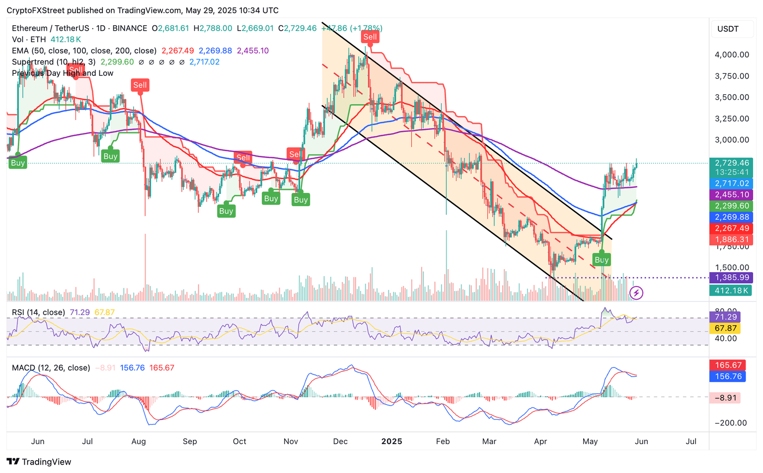 Ethereum's price hovers around $2,729 at the time of writing as bulls push to close the gap to $3,000 in the short term. The smart contracts token sits above key moving averages, ranging from the 200-day Exponential Moving Average (EMA), which offers support at $2,455, the 100-day EMA at $2,269, and the 50-day EMA at $2,267. With the moving averages trailing the price, the path of the least resistance could stay upward in the coming days, reducing the potential for sudden pullbacks.