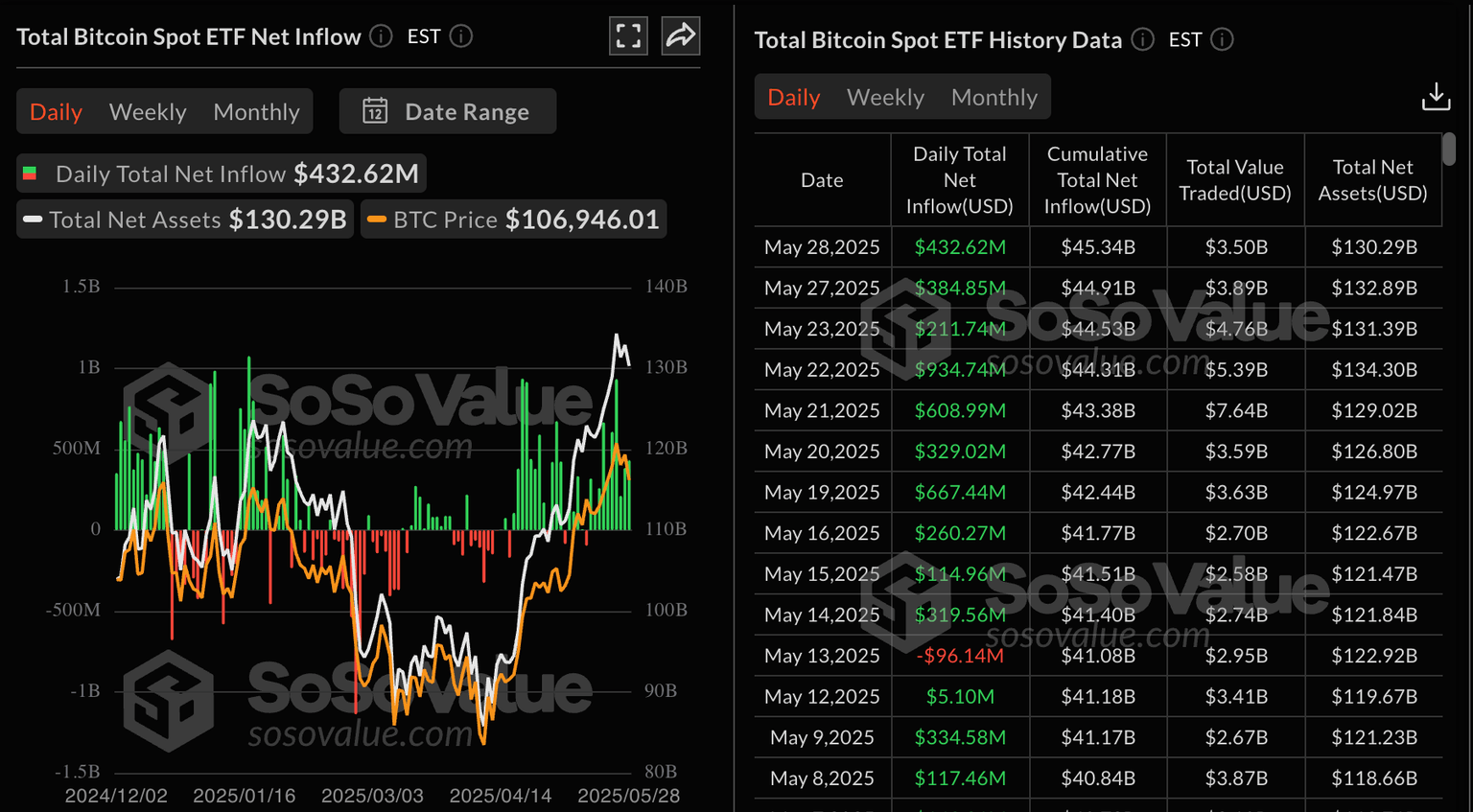 Bitcoin's rally to new all-time highs was majorly driven by growing institutional interest, with Exchange Traded Funds (ETFs) posting ten consecutive days of inflows. SoSoValue data shows that Bitcoin ETFs recorded approximately $433 million in net inflow volume on Wednesday, slightly higher than the $385 million posted on Tuesday. Still, the level of inflows is way below those seen earlier this month, when BTC reached the fresh ATH.