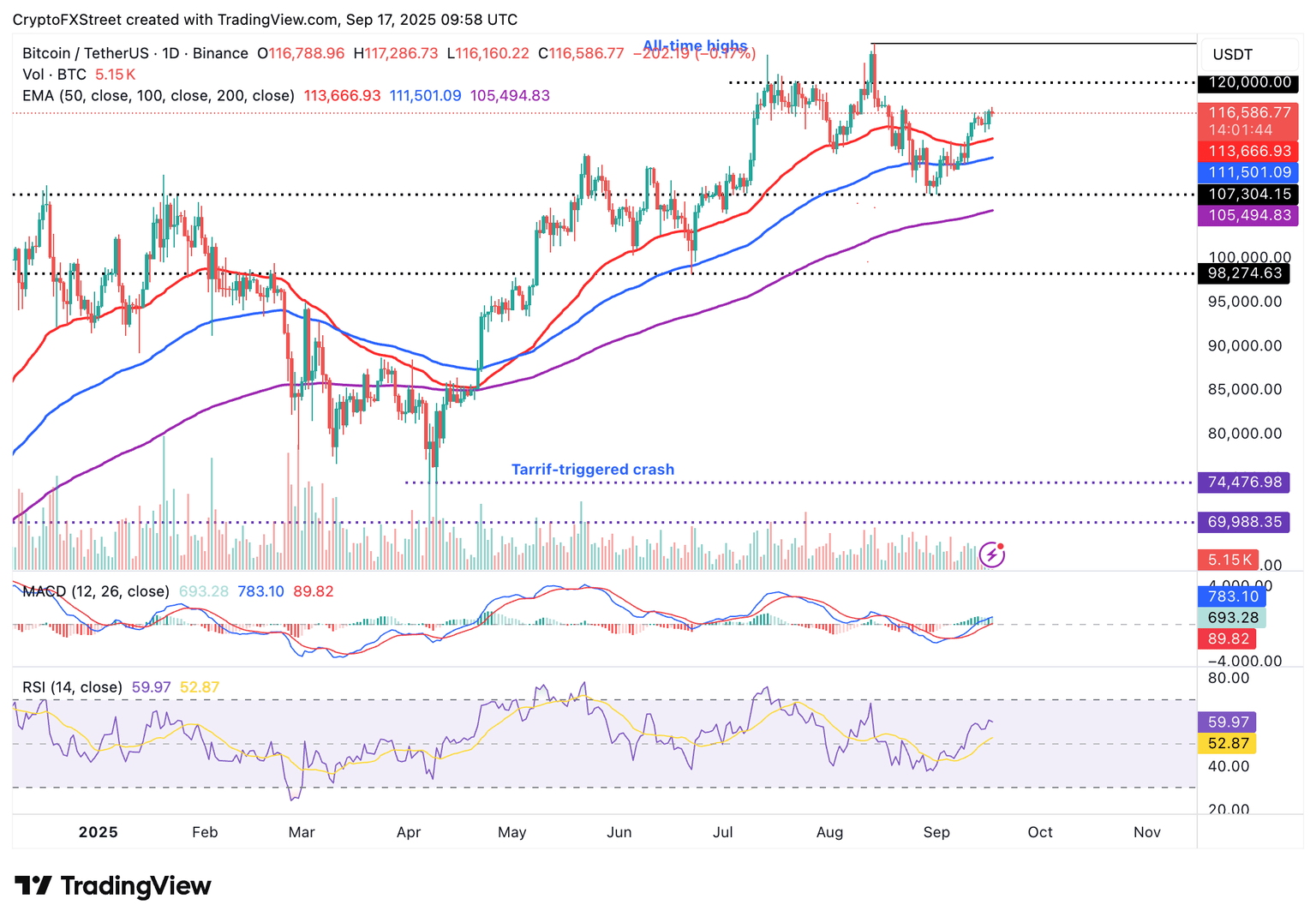 Bitcoin (BTC) exhibits subtle bullish potential, trading marginally below $117,000 at the time of writing after pulling back from an intraday high of $117,286. The uptick in price can be attributed to several factors, including steady United States (US) Exchange Traded Funds (ETF) inflows and growing optimism that the Federal Reserve (Fed) could deliver an interest rate cut later on Wednesday.