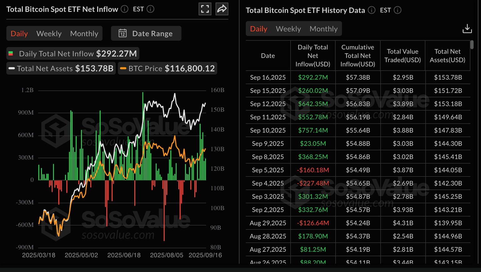 Institutional demand for Bitcoin through ETFs has steadily increased since September 8. SoSoValue data shows that BTC ETFs extended the inflow streak for seven consecutive day with approximately $292 million net streaming in on Tuesday.