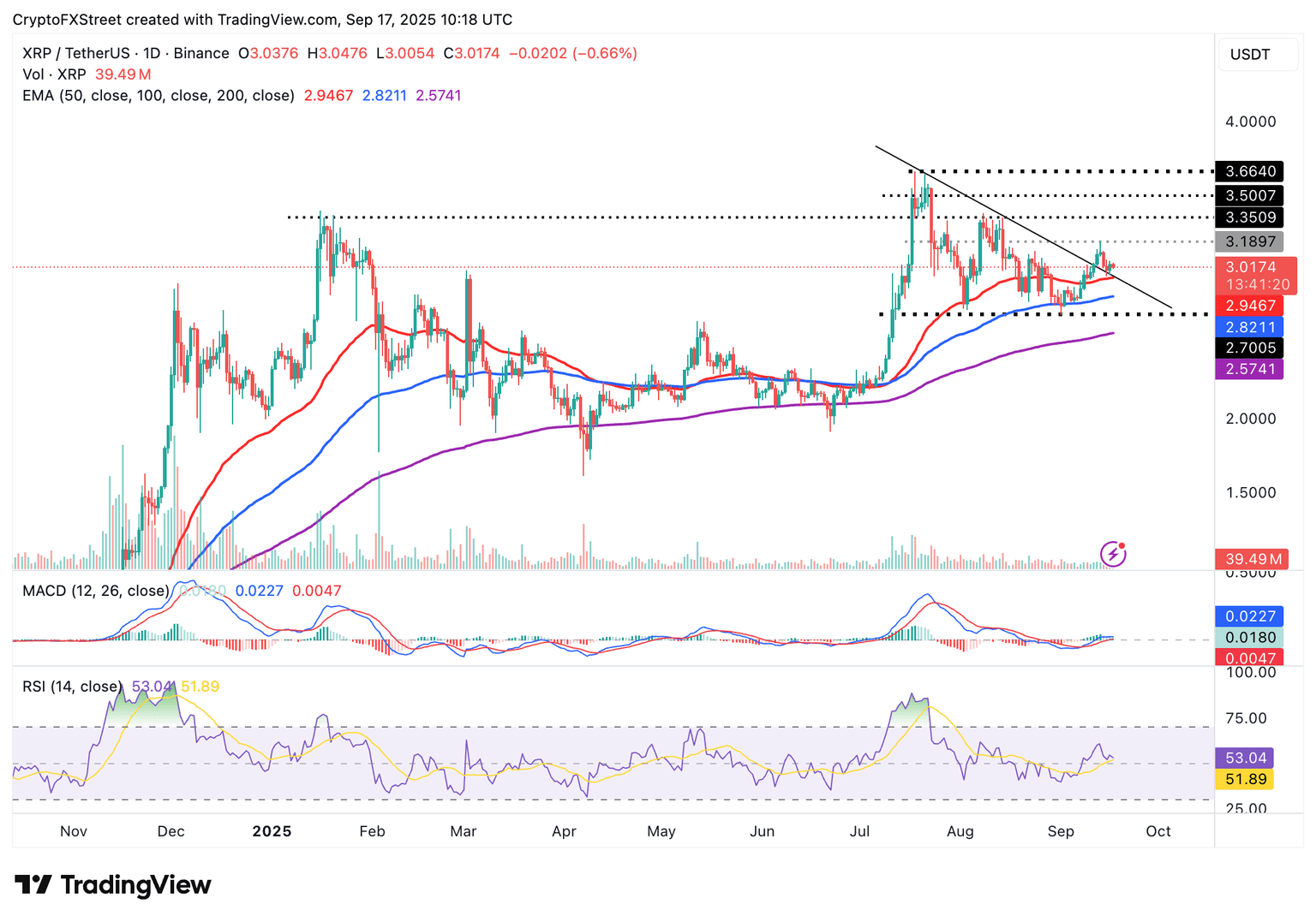 Still, the MACD indicator backs XRP's short-term bullish case, maintaining a buy signal since September 8. Investors will consider increasing their exposure to XRP with the blue MACD line remaining above the red signal line. Bullish targets are the $3.35 level, which was previously tested on August 14, and the record high of $3.66.