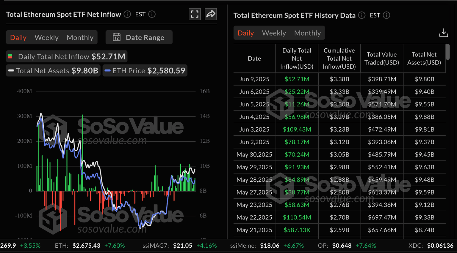 Ethereum spot ETFs saw an increase in inflow volume to $53 million on Monday, up from $25 million recorded on Friday. Interest in Ethereum-related products has steadied since the Pectra upgrade on May 7. Based on the chart below, ETH spot ETFs have sustained a 15-day streak, resulting in a cumulative net inflow of $3.38 billion.