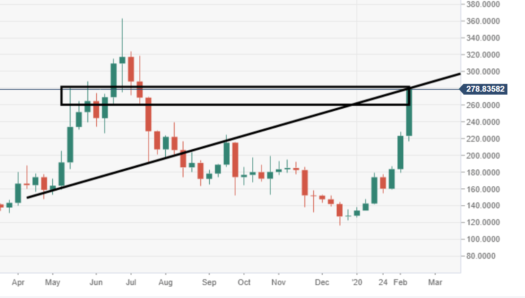 ETH/USD is currently trading at $281 (+5.80%), market bulls are continuing to push aggressively north.