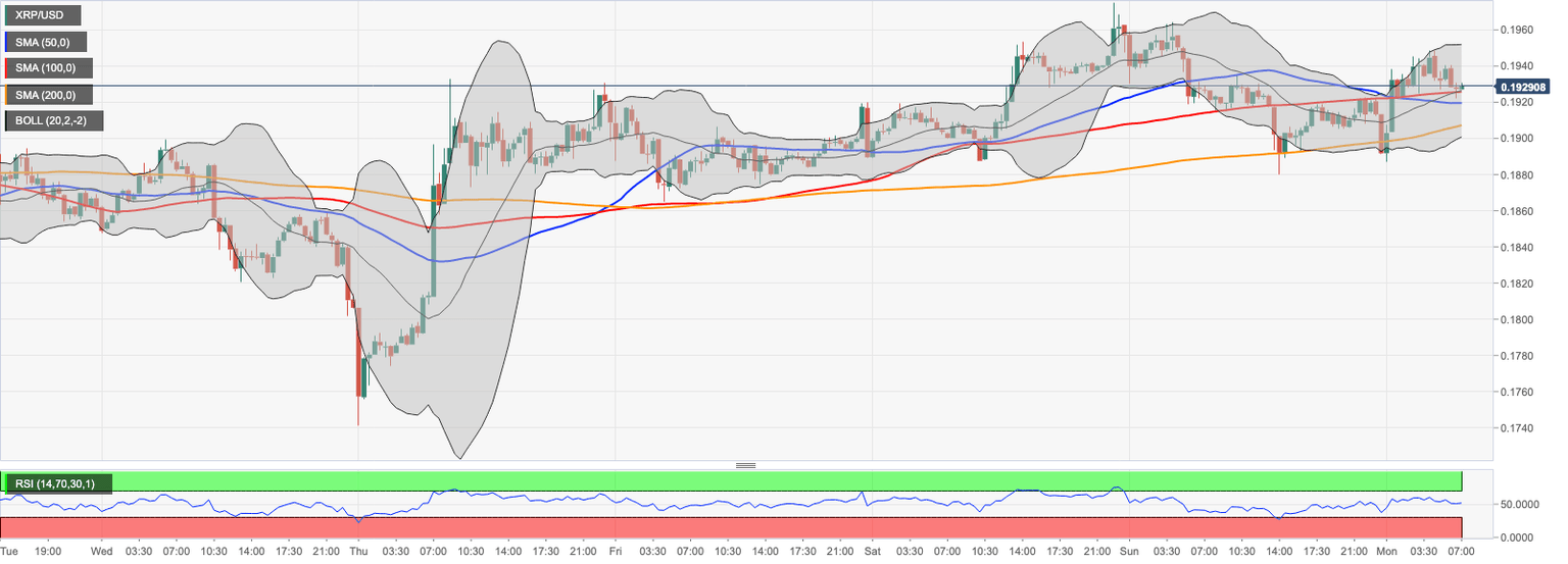 XRP/USD is changing hands at $0.1950 during early Asian hours, close the intraday high of $0.1948. The coin has gained 2.9% since the beginning of the day. From the short-term perspective, XRP/USD is trading within a bullish trend amid low volatility.