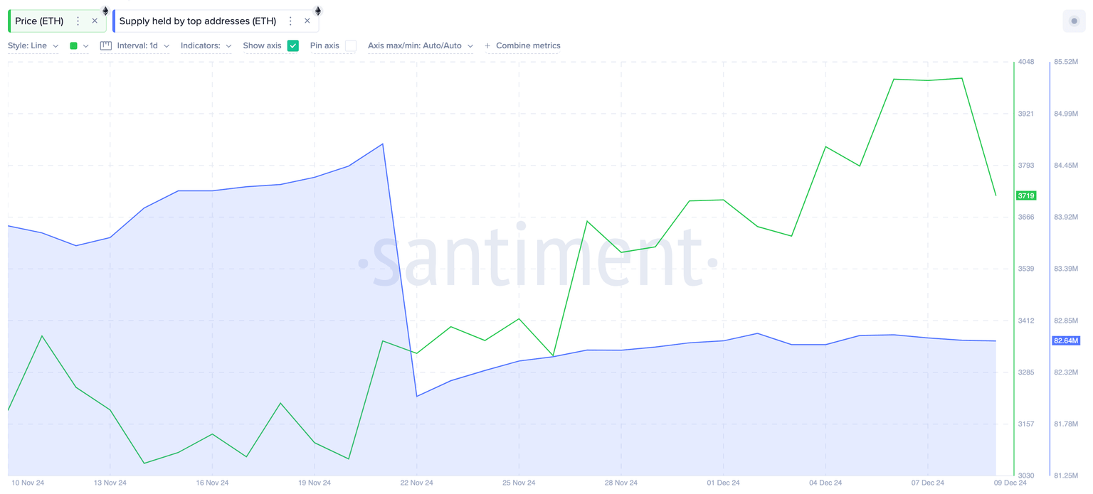 Santiment's chart below depicts real-time changes in balances held by the top 1,000 wallets with the largest ETH holdings.